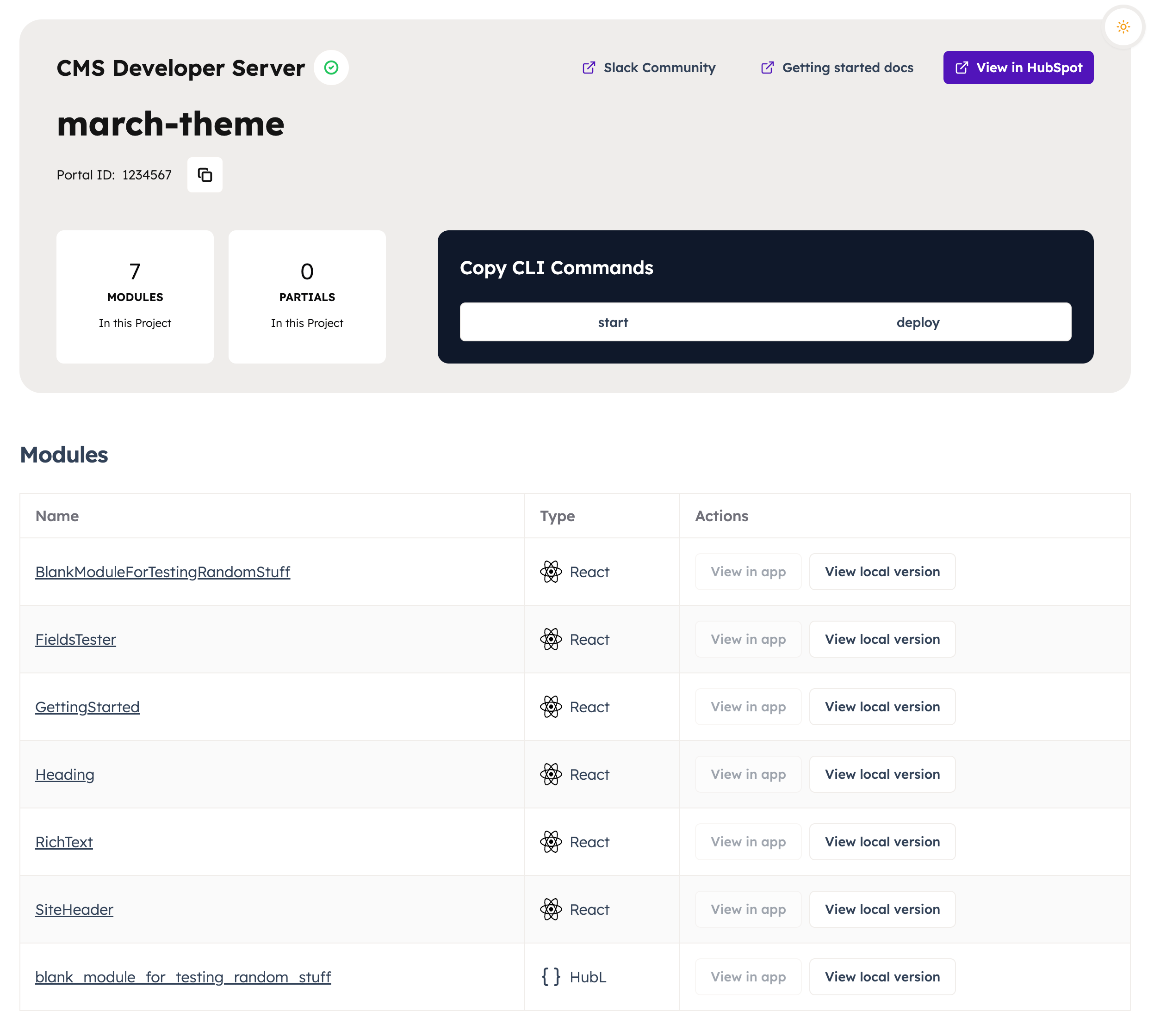 The main page at https://hslocal.net:3000/ will display a list of your theme’s templates and modules, all of which can be individually previewed by clicking the provided links.